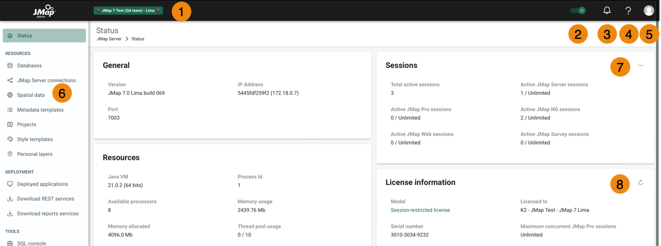 <table data-header-hidden><thead><tr><th width="69.5"></th><th></th></tr></thead><tbody><tr><td><strong>1</strong></td><td>You can specify the JMap Server name in the <a href="../jmap-server/jmap-server-settings">JMap Server Settings</a> section.</td></tr><tr><td><strong>2</strong></td><td>You can select a light or dark interface. </td></tr><tr><td><strong>3</strong></td><td>You receive notifications, particularly when new versions of the JMap Server products comprising your license are available. </td></tr><tr><td><strong>4</strong></td><td>This section gives you access to this manual, examples, the Knowledge Base and the K2 Geospatial Customer Portal. From there you can communicate with the Service team responsible for technical support. </td></tr><tr><td><strong>5</strong></td><td><p>This section allows you to:</p><ul><li>Select the JMap Admin display language. The language chosen in this menu as well as the language chosen in the connection interface is recorded by JMap Admin which displays it by default during subsequent sessions.</li><li>Change account password.</li><li>Change GUI to old version.</li><li>Disconnect from the session.</li></ul></td></tr><tr><td><strong>6</strong></td><td>The sidebar allows you to access the main sections of JMap Admin. These are grouped by theme: Resources, Deployment, Tools, Extensions, JMap Server.</td></tr><tr><td><strong>7</strong></td><td>Shortcut buttons allow you to access a specific section quickly</td></tr><tr><td><strong>8</strong></td><td>This button allows you to reload the license.</td></tr></tbody></table>
