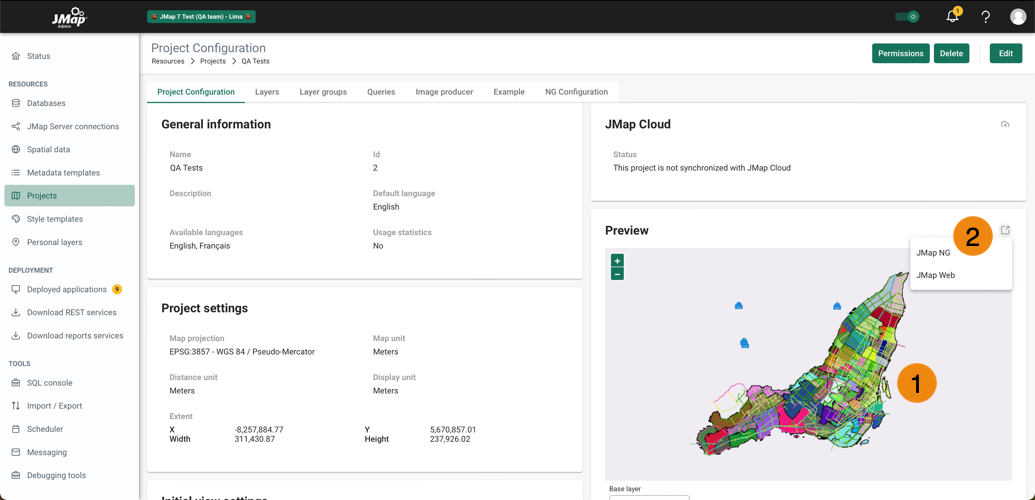 <table data-header-hidden><thead><tr><th width="82.5"></th><th></th></tr></thead><tbody><tr><td><strong>1</strong></td><td>JMap Admin provides a preview of each project at all times, as you make changes to it.</td></tr><tr><td><strong>2</strong></td><td>You can open your project with JMap NG or JMap Web without leaving JMap Admin.</td></tr></tbody></table>