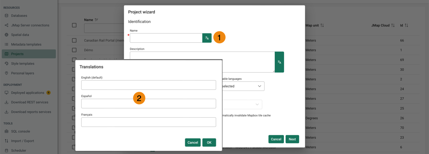 <table data-header-hidden><thead><tr><th width="80.5"></th><th></th></tr></thead><tbody><tr><td><strong>1</strong></td><td>When this button <img src="https://2224254070-files.gitbook.io/~/files/v0/b/gitbook-x-prod.appspot.com/o/spaces%2FDUF1p2rT0hfE3QBlbbvE%2Fuploads%2FeuBkQkUz56cWgHAYJXbB%2Flangues.png?alt=media&#x26;token=2820bccd-3461-4142-b2a5-097200d6d2a3" alt="" data-size="original"> is displayed, it indicates that you can add translations for the various languages you want the system to support.</td></tr><tr><td><strong>2</strong></td><td>Each resource can be translated into several languages.</td></tr></tbody></table>