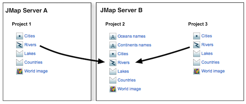 JMap Server allows you to share layers between projects that are on the same server or that originate from remote servers that are connected.