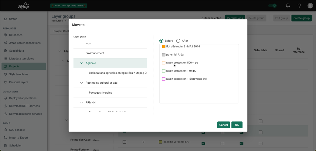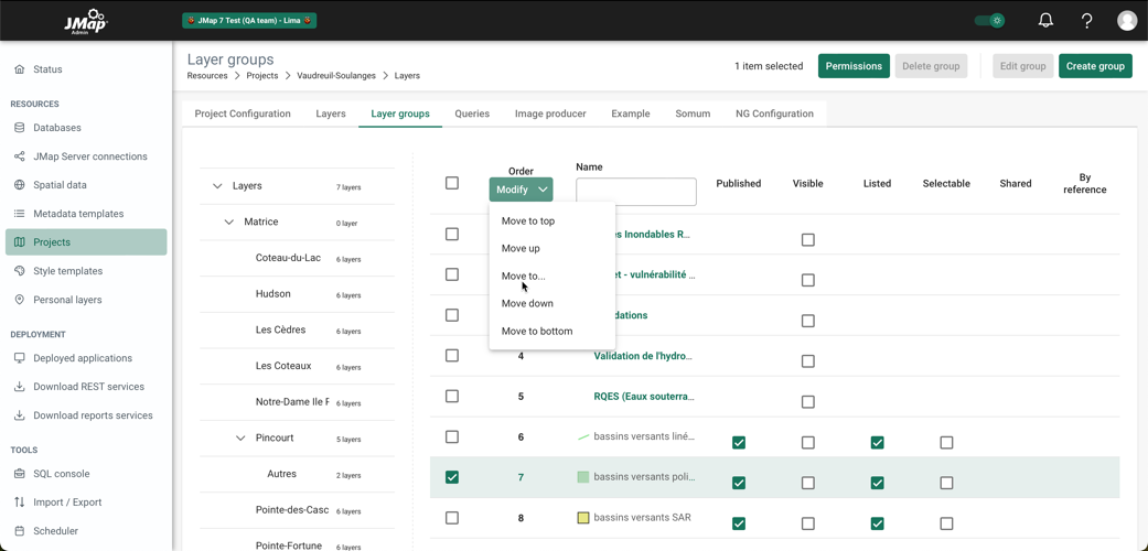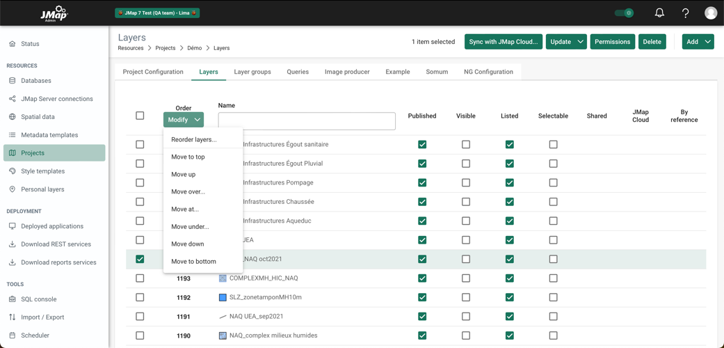 To change the order, you must use the **Modify** menu located at the top of the column displaying the position of each layer. You can also select one or more layers and move them using the available options (Move up, Move down, Move at…, etc.). The option **Reorder layers** opens a window displaying all the layers that you can reorder using drag-and-drop actions.