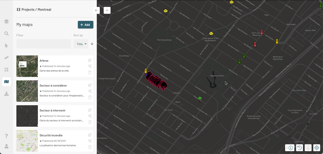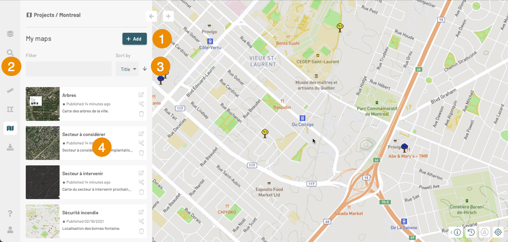 <table data-header-hidden><thead><tr><th width="87"></th><th></th></tr></thead><tbody><tr><td><strong>1</strong></td><td>This tool allows you to add a customized map. <br>The section titled <a href="#creating-a-customized-map">Creating a customized map</a> lists the steps to do this.</td></tr><tr><td><strong>2</strong></td><td>The <strong>Filter</strong> field allows you to filter maps based on the terms that you enter and that are found in the title or description of the maps.</td></tr><tr><td><strong>3</strong></td><td><strong>Sort by</strong> allows you to sort maps based on the date they were created or their title: <br>1. Select the option in the drop-down menu. <br>2. Click on the arrow to indicate if you wish to sort the maps in ascending or descending order.</td></tr><tr><td><strong>4</strong></td><td><p>Each customized map is displayed in a card that includes its title, its description, and tools to do the following: </p><p><img src="https://content.gitbook.com/content/DUF1p2rT0hfE3QBlbbvE/blobs/El5ckdBOzwuol64gVwPk/context-maj.png" alt="" data-size="line"> <strong>Update the map</strong>: If the data has changed, click on this icon in order for the customized map record to include the most recent version of the map. </p><p><img src="https://content.gitbook.com/content/DUF1p2rT0hfE3QBlbbvE/blobs/lvC1a420UwxLAYFdYpnz/context-share.png" alt="" data-size="line"> <strong>Share the map</strong>: Contains tools to share the map and copy it to the clipboard. For details on these functions, refer to <a href="#sharing-a-customized-map">Sharing a customized map</a>. </p><p><img src="https://content.gitbook.com/content/DUF1p2rT0hfE3QBlbbvE/blobs/dDkl9bQUDmpeUQuqWKaI/context-delete.png" alt="" data-size="line"> <strong>Delete map context</strong>: Click on the icon to delete the map. <br>You can change the <strong>title</strong> and <strong>description</strong> of the map: <br>1. Click on the title or description to place the cursor in the appropriate field. <br>2. Change the title or description. <br>3. Click on <img src="https://content.gitbook.com/content/DUF1p2rT0hfE3QBlbbvE/blobs/F4KLey81t0TJmfxZivDE/accepter.png" alt="" data-size="line"> to save the changes or click on <img src="https://content.gitbook.com/content/DUF1p2rT0hfE3QBlbbvE/blobs/wvNaArpYYj6ICzeEx7y0/refuser.png" alt="" data-size="line"> to cancel them.</p></td></tr></tbody></table>