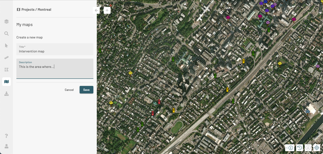 1. Click on <img src="https://content.gitbook.com/content/DUF1p2rT0hfE3QBlbbvE/blobs/lxquTZRuuvusZS0dj6df/context.png" alt="img" data-size="line"> to open the **My maps** panel. The icon will change color.