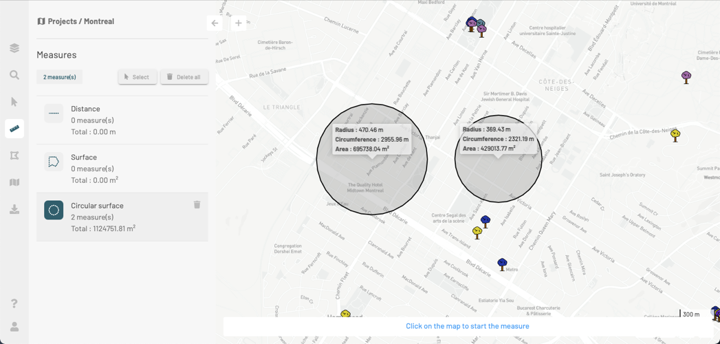 1. Click on <img src="https://content.gitbook.com/content/DUF1p2rT0hfE3QBlbbvE/blobs/e2jdALmwmBh3PDZcBcjd/superficie-circulaire.png" alt="img" data-size="line"> to enable the tool. The icon changes color. Instructions appear at the bottom of the map to help you make your measurements.