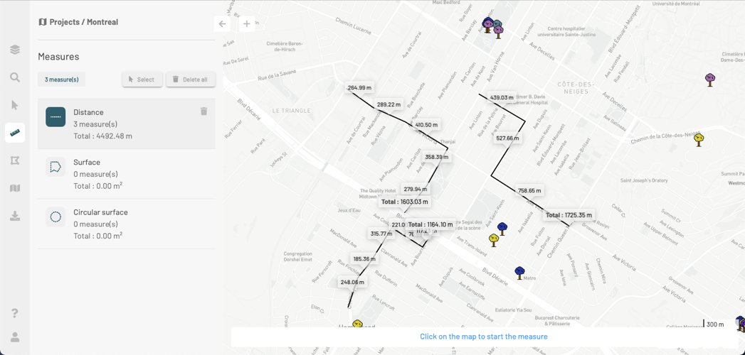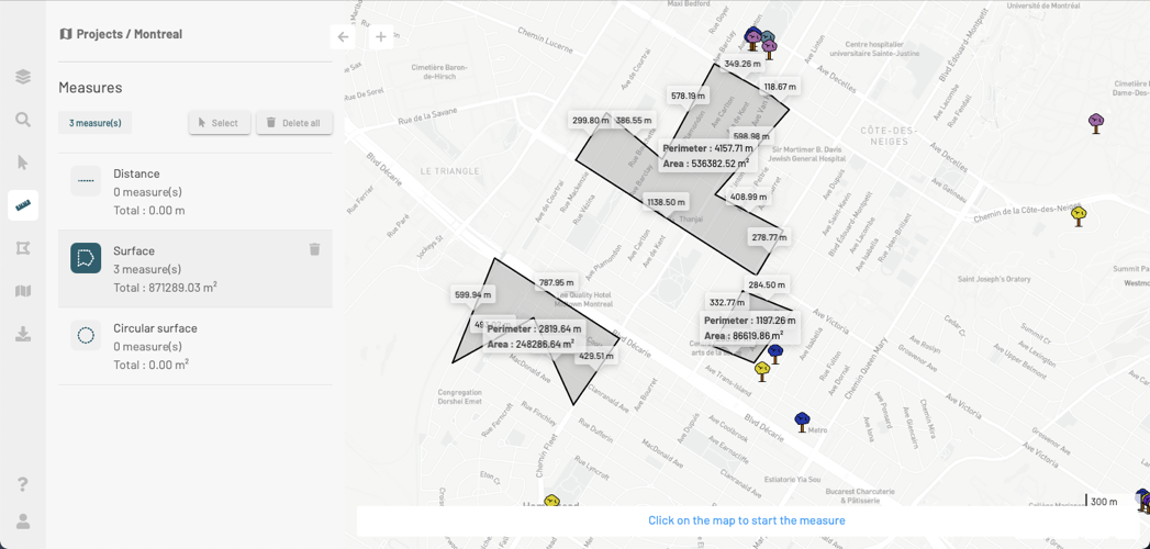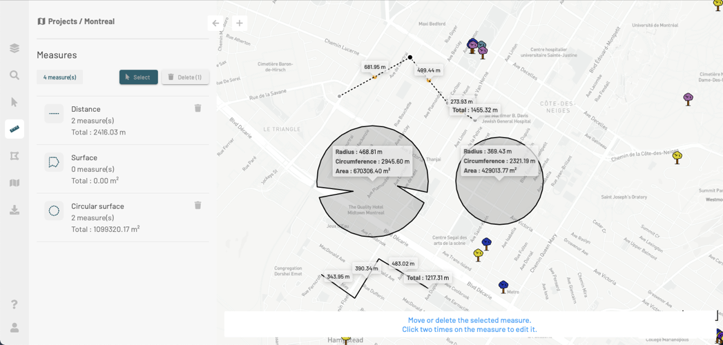 The tools found in the **Measurements** panel allow you to measure distances and surfaces (area and perimeter) on the map.