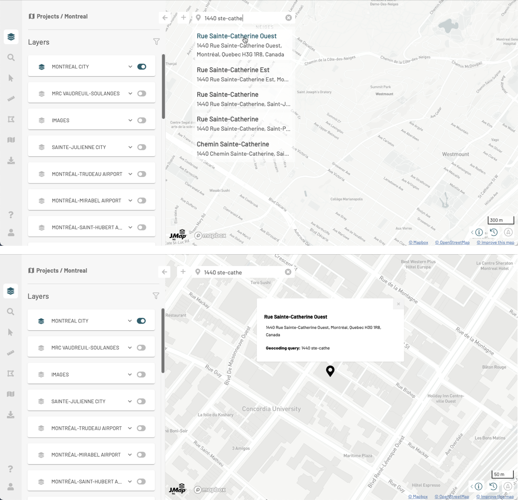 to open the box and write location information.Enter search terms. You can enter an address, a postal code, a city name, a place, etc. JMap NG uses the Mapbox Geocoding service to find the location. As you enter information, places with matching information are displayed.