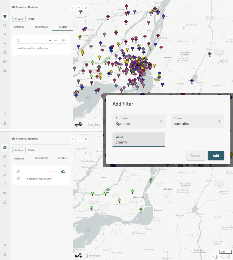 Press Add. Only items in the layer that pass the filter are displayed on the map.
