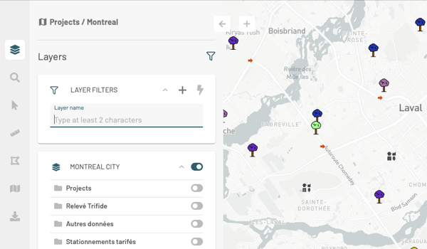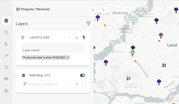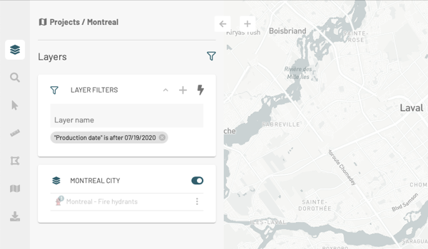 to apply the filter to the map. Only the layers which pass the filter and whose display is activated are displayed in the map.