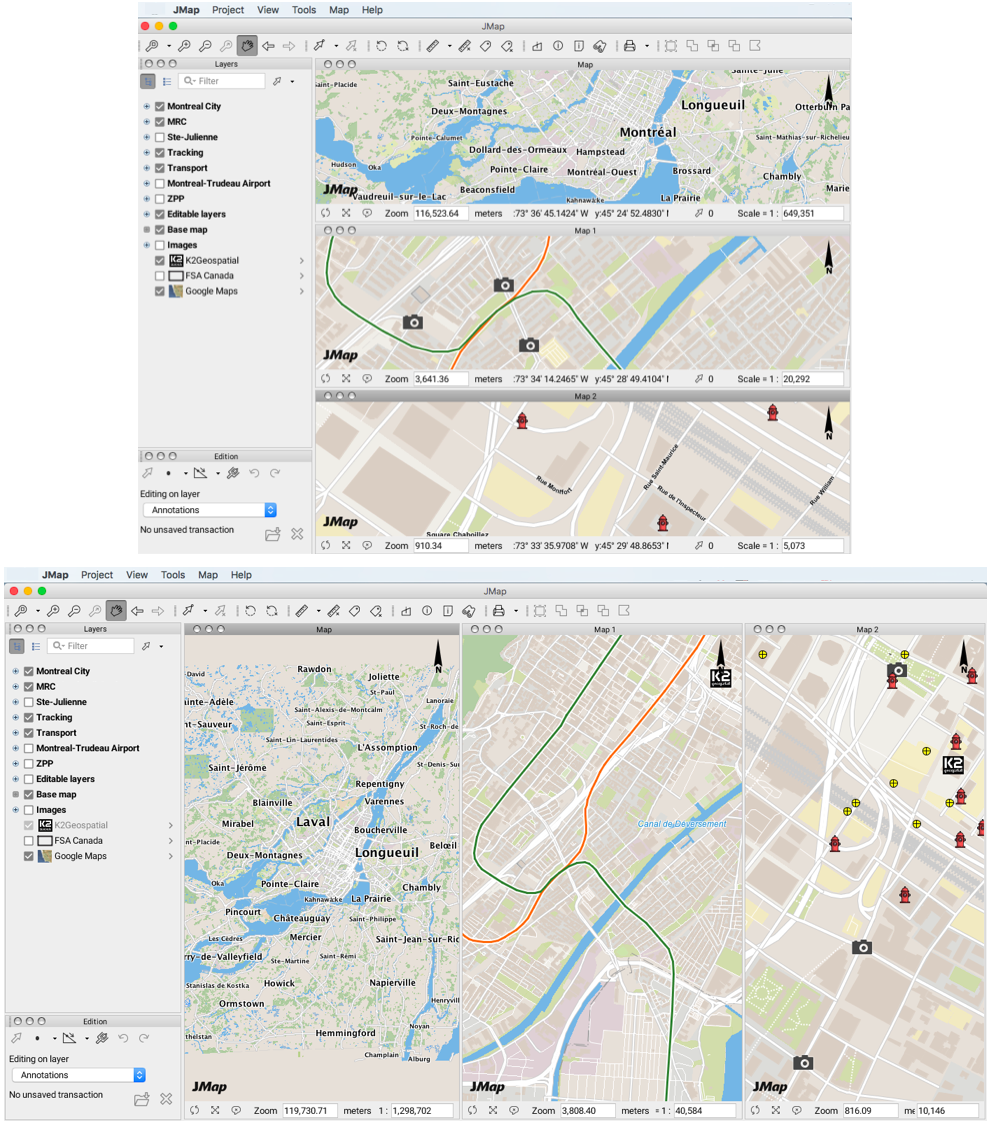 JMap Pro allows you to open several maps simultaneously; each map is independent from the others. Thus, you can navigate in each map and display or hide layers in one map or another. Maps can be piled one on top of the other or placed side by side to be viewed simultaneously.