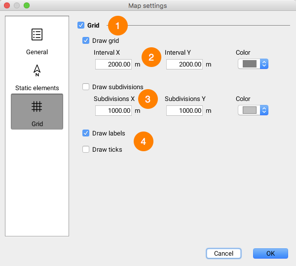 <table data-header-hidden><thead><tr><th width="84"></th><th></th></tr></thead><tbody><tr><td><strong>1</strong></td><td>Activate the grid.</td></tr><tr><td><strong>2</strong></td><td>Select this option to have the grid show the division lines. <br>Specify the X and Y intervals between the lines in the grid. <br>You can also select the color of the division lines.</td></tr><tr><td><strong>3</strong></td><td>Select this option to have the grid show the subdivision lines. <br>Specify the X and Y intervals between the subdivision lines. <br>You can also select the color of the subdivision lines.</td></tr><tr><td><strong>4</strong></td><td>You can add labels indicating the grid's coordinates and ticks on the edges of the grid (view image below).</td></tr></tbody></table>