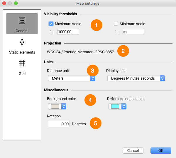 <table data-header-hidden><thead><tr><th width="73"></th><th></th></tr></thead><tbody><tr><td><strong>1</strong></td><td>Scale limits are used to limit the map's display scale. <br>This prevents users from zooming too far in or out. <br><strong>Maximum scale</strong>: Maximum scale limit for zooming in on the map. <br><strong>Minimum scale</strong>: Minimum scale limit for zooming out on the map.</td></tr><tr><td><strong>2</strong></td><td>Application's map projection system.</td></tr><tr><td><strong>3</strong></td><td>Select units used on the map. <br><strong>Distance unit</strong>: The distance unit is used to display all distance-related values (measurements, zoom level, etc.). <br><strong>Display unit</strong>: Unit used to display map coordinates.</td></tr><tr><td><strong>4</strong></td><td><strong>Background color</strong>: Select background color for map window. <br>Background color appears wherever there is no visible data. <br><strong>Default selection color</strong>: Select default selection color. <br>Selected objects will be of this color unless a different selection style is defined for their layer.</td></tr><tr><td><strong>5</strong></td><td>Enter rotation used to display map, in degrees. <br>Rotation is performed clockwise.</td></tr></tbody></table>