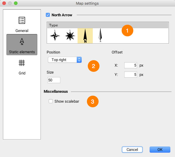 <table data-header-hidden><thead><tr><th width="81"></th><th></th></tr></thead><tbody><tr><td><strong>1</strong></td><td>Select the <strong>North Arrow</strong> option to enable the display of the north arrow on the map. Afterwards, select the arrow model you wish to use. <br>If the map is rotated, the north arrow will indicate this rotation.</td></tr><tr><td><strong>2</strong></td><td>Select the arrow's position on the map. <br>You can also offset the arrow from the chosen position by entering values in pixels. <br>In addition, the size of the arrow can be adjusted.</td></tr><tr><td><strong>3</strong></td><td>Enable the graphic scale to be displayed by selecting this option.</td></tr></tbody></table>