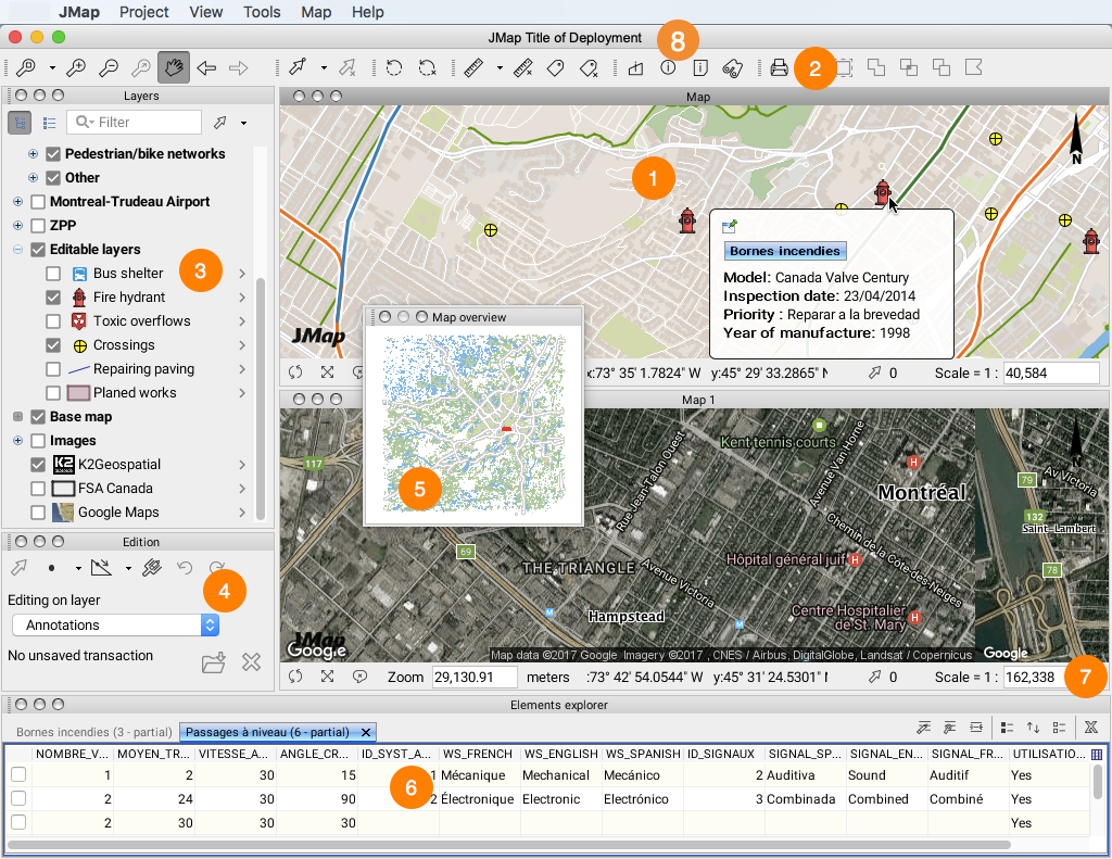 Map displaying a portion of data. It is possible to open several maps at once and organize them according to your needs. Each map is independent from the others. Maps are interactive and allow for easy querying of objects.