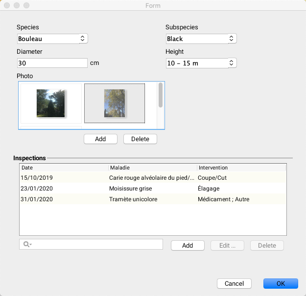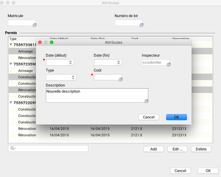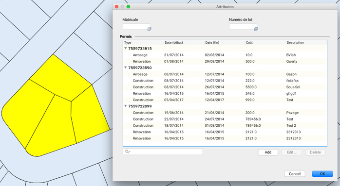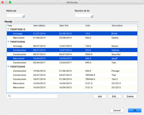 You can also batch edit the attributes of a selection of elements from certain layers. Indeed, when a layer contains forms with subforms, you can edit the attributes of the form or of a subform in batches, for a set of elements you have selected. In the case of subforms, editing includes adding new records as well as modifying or deleting existing records.