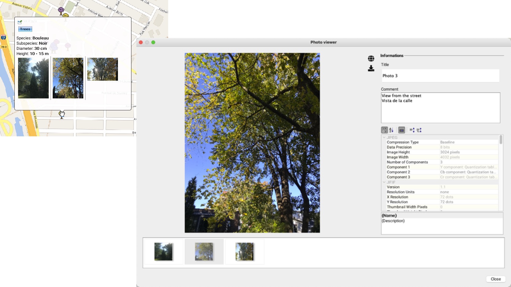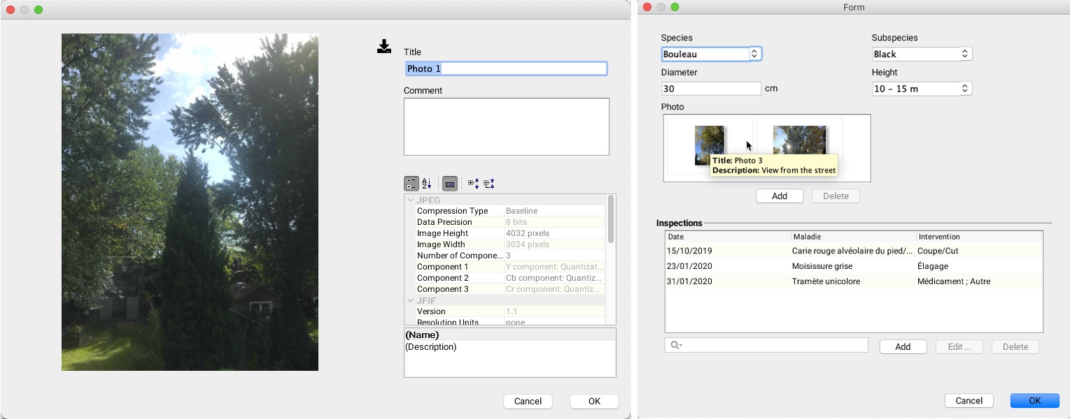 If the form contains a relevant field, you can add photos (standard and 360 degrees) from your computer's file system. You can also add a title and comments to photos that were entered using a JMap Survey application, or to photos that were uploaded as files in the forms of JMap Pro and JMap Web applications. To do this: