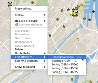 To modify the attributes of an element you must click on the element in the map with the right button in order to display the pop-up menu. Select the **Edit attributes** function and select the element you want to edit. Notice that all the elements of the editable layers that are in the place where you clicked are displayed.