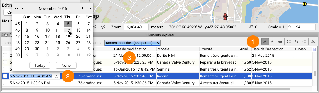 <table data-header-hidden><thead><tr><th width="72"></th><th></th></tr></thead><tbody><tr><td><strong>1</strong></td><td>Press <img src="https://content.gitbook.com/content/DUF1p2rT0hfE3QBlbbvE/blobs/rxUR4GvTVqfJ3E9sja5C/edit_attributes_18x18.jpg" alt="" data-size="line"> to enable theedit mode. <br>In this mode, all modifiable attribute values can be entered or changed. <br>Afterward, click on a field to change its value. Date fields display a calendar to facilitate data entry. <br>Values that are entered are validated in order to ensure their compatibility with the attribute type.<br>For more information on how to use the elements explorer, refer to <a href="../elements-explorer">Elements Explorer</a>.</td></tr><tr><td><strong>2</strong></td><td>Click on a field to enter or modify the attribute value.</td></tr><tr><td><strong>3</strong></td><td>Some of the attributes that are displayed cannot be edited (Author, Creation Time, Modification Time, ID JMap). <br>These are system attributes and their values are automatically set by JMap.</td></tr></tbody></table>