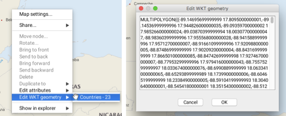 The pop-up menu also allows you to edit WKT elements. The **Edit WKT geometry** function displays the elements of the layers found at the map point where the context menu is open. Select one of the elements to open the window containing the element's coordinates and data. If you have the appropriate permissions, you can edit this data.