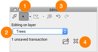 <table data-header-hidden><thead><tr><th width="80"></th><th></th></tr></thead><tbody><tr><td><strong>1</strong></td><td>Select the type of geometry you wish to create. <br>Your selection must not be incompatible with the type of layer (e.g. you cannot create polygons on a layer of points).</td></tr><tr><td><strong>2</strong></td><td>Select the layer on which you wish to create elements. <br>If several editable layers have been added to the project (including personal layers), they will all appear in this list.<br><strong>Note</strong>: The layer named <strong>Annotations</strong> is not a personal layer. It is a generic layer on which you can draw freely but it does not allow you to define attributes.</td></tr><tr><td><strong>3</strong></td><td>When you bring changes (add, modify, delete) to a personal layer, JMap stores the transactions that should be saved.<br>Press <img src="https://content.gitbook.com/content/DUF1p2rT0hfE3QBlbbvE/blobs/T9vEhrVlL7D5F91mPONk/save_editions.jpg" alt="" data-size="line"> to save the layer transactions on the JMap server.<br>Press <img src="https://content.gitbook.com/content/DUF1p2rT0hfE3QBlbbvE/blobs/7QuxGcz3aRN8VuuWMVHC/discard_drawings.jpg" alt="" data-size="line"> to reject the transactions and cancel all changes on the layer.</td></tr><tr><td><strong>4</strong></td><td>All editing operations can be canceled individually if they have not been saved. <br>You can also restore canceled actions by clicking on the <strong>Redo</strong> arrow.</td></tr></tbody></table>
