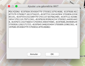 The **Edition** extension also allows you to edit WKT elements. You can add WKT elements from **Tools -> Add WKT geometry** in the menu bar. A window opens, allowing you to enter the coordinates of the elements you want to add.