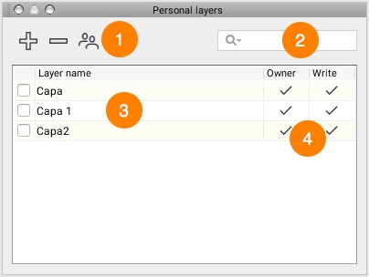 The personal layer management interface shows you a list of the personal layers you can access. These layers may have been created by you or by other users who shared them with you. This window can be accessed through the Project -> Personal layers... menu or by pressing CTRL+L.