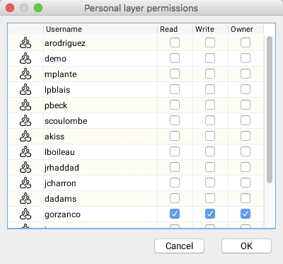 Share icon in the personal layer management window. The following window appears and shows the list of users, allowing you to define permissions for each one.