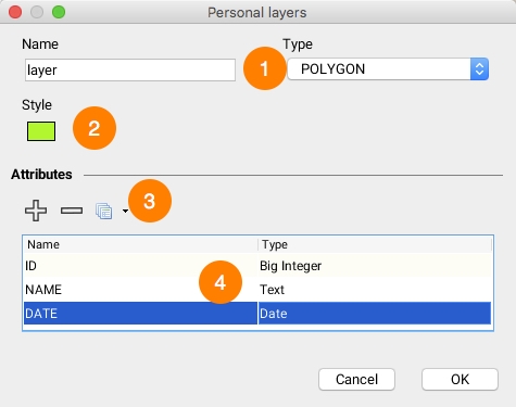 Name: Enter the name of the layer. Names do not have to be unique, but we recommend using names that have meaning; spaces can be used in the names. Type: Indicate which type of elements (point, line or polygon) the layer will contain.