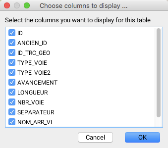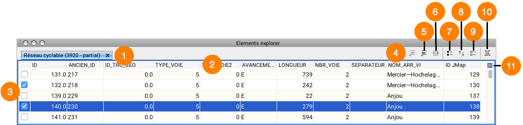 <table data-header-hidden><thead><tr><th width="78"></th><th></th></tr></thead><tbody><tr><td><strong>1</strong></td><td>Each tab is associated with a layer. <br>The name of the layer is indicated, along with the number of elements that are loaded. The number of elements that are loaded on a layer can be inferior to the total number of elements contained within the layer. <br>In this case, a special note ("partial") is added to the title of the tab.</td></tr><tr><td><strong>2</strong></td><td>Each layer attribute is represented by a column in the table. <br>The column header indicates the attribute title. <br>You can sort the table according to the values of an attribute by clicking on the header of the corresponding column. <br>You can also sort the table according to several attributes by holding down the CTRL key and clicking on several headers. <br>Lastly, you can move a column by selecting its header and dragging it horizontally.</td></tr><tr><td><strong>3</strong></td><td>The check boxes of the first column are used to select elements. <br>All elements that are selected in the table will appear selected on the map. <br>Conversely, all elements selected using selection tools on the map will be selected in the table.</td></tr><tr><td><strong>4</strong></td><td>Press this button to enable edit mode. <br>Edit mode allows you to modify attribute values and to erase elements. <br>This function is only available with editable layers including <a href="editable-layers/personal-layers">personal layers</a>.</td></tr><tr><td><strong>5</strong></td><td>Press this button to enable the automatic zoom function. <br>If this function is enabled, the selected rows in the table will cause the map to zoom in on the associated map elements.</td></tr><tr><td><strong>6</strong></td><td>Press this button to enable the automatic highlight function. <br>When this function is enabled, the elements corresponding to the selected rows will blink on the map.</td></tr><tr><td><strong>7</strong></td><td>Press this button to select all of the layer's elements.</td></tr><tr><td><strong>8</strong></td><td>Press this button to invert the selection on the layer. <br>All selected elements will become unselected and vice-versa.</td></tr><tr><td><strong>9</strong></td><td>Press this button to unselect all of the layer's elements.</td></tr><tr><td><strong>10</strong></td><td>This button allows you to open the attributes table in a spreadsheet program such as Excel or export the table to a file in CSV format.</td></tr><tr><td><strong>11</strong></td><td><p>This button allows you to select the attributes to be displayed in the explorer.</p><p><img src="https://content.gitbook.com/content/DUF1p2rT0hfE3QBlbbvE/blobs/xgnAorsxtq9rGFP7Rlgl/clip0013.jpg" alt="" data-size="original"></p></td></tr></tbody></table>