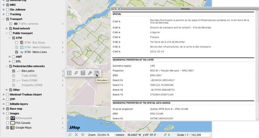 Information on the various layers of a project can be available in JMap Pro. This information could include the source of data, the date the last update was performed, the quality of the data, etc. This information, called layer metadata, is configured by the JMap administrator.