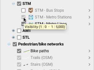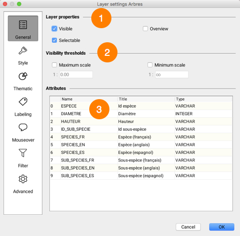 <table data-header-hidden><thead><tr><th width="84"></th><th></th></tr></thead><tbody><tr><td><strong>1</strong></td><td><strong>Visible</strong>: Determines whether the layer is visible or invisible. Only visible layers are displayed on the map. <br><strong>Selectable</strong>: Determines if layer elements are selectable. If this option is not selected, the elements of the layer cannot be selected using the selection tools. <br><strong>Overview</strong>: Adds layer to application overview. Overview can be enabled by selecting <strong>View->Map overview</strong> or by using the <strong>CTRL-O</strong> keyboard shortcut.</td></tr><tr><td><strong>2</strong></td><td><p>Visibility thresholds define the scale range within which a layer is displayed on the map. <br>If the displayed map scale does not fall within the minimum and maximum values, the layer will not be displayed. <br>If the options are not selected, thresholds will be ignored. If a layer is grayed out in the layer manager, this indicates that it is not displayed due to visibility thresholds.<br>Depending on what the JMap administrator has decided, it is possible that these options cannot be modified. </p><p><img src="https://content.gitbook.com/content/DUF1p2rT0hfE3QBlbbvE/blobs/oHIVkRS0f7LFfqs02I7v/seuils.jpg" alt="" data-size="original"></p></td></tr><tr><td><strong>3</strong></td><td>Attributes that are bound to the layer's elements are presented in this table. <br>Attribute titles and types are indicated. <br>Layer attributes are descriptive data associated with layer elements. <br>They are used for mouseover bubbles, labels, thematic maps, etc.</td></tr></tbody></table>