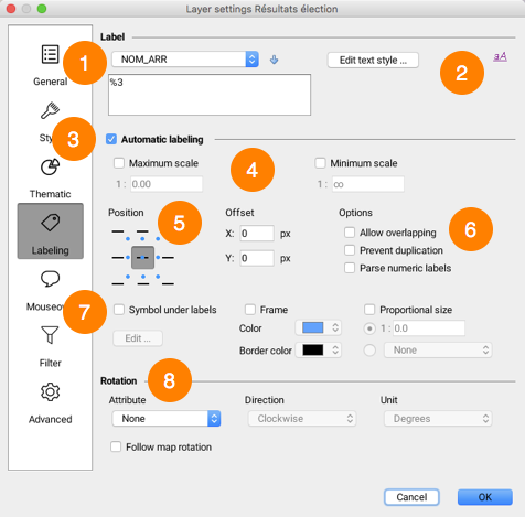 Rotation options allow you to control the way labels are rotated. Attribute: Choose the attribute containing the rotation to apply to each layer symbol. Only numeric attributes are available. Direction: If an attribute is used for the rotation, indicate the direction of the rotation (clockwise or counterclockwise). Follow map rotation: Select this option to have labels follow map rotation. If a map rotation is set, the same rotation will apply to the labels.