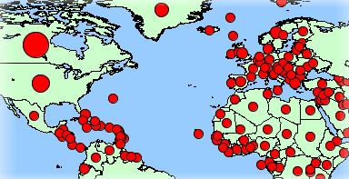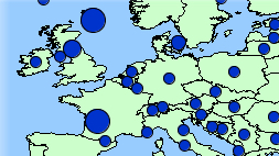 Graduated symbols thematics draw circular symbols on the map elements they qualify. The symbol sizes graduate according to a finite number of categories based on a numeric attribute.