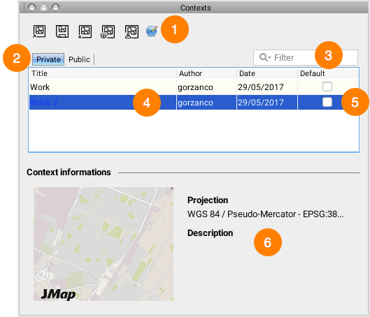 <table data-header-hidden><thead><tr><th width="83"></th><th></th></tr></thead><tbody><tr><td><strong>1</strong></td><td>The following options are available: <br><strong>Open</strong>: Select the context to open and click on the button to display it. <br><strong>Save context...</strong>: Click on this button to create a new context from the displayed map.<br><strong>Delete</strong>: Select the context to delete and click on the button to delete it. <br><strong>Make public</strong>: Select the context you wish to make public and click on the button to make it accessible to all users. <br><strong>Send a copy</strong>: Select the context you wish to send and choose the recipient in the list. The recipient will then see a pop-up in JMap notifying him or her that a context has been added to his or her list of private contexts. <br><strong>Change projection</strong>: This advanced function allows you to change the projection associated with a context. This can be useful after an administrator has changed the projection of a JMap project.</td></tr><tr><td><strong>2</strong></td><td>Click on the tab associated with the list of contexts to be viewed (public or private).</td></tr><tr><td><strong>3</strong></td><td>When entering a query in this search field, only the contexts whose names include the contents of the query will be displayed.</td></tr><tr><td><strong>4</strong></td><td>List of contexts showing the author and creation date of each context.</td></tr><tr><td><strong>5</strong></td><td>Allows you to select a context that will be displayed by default when a JMap session is opened.<br> Only one context can be defined with this option.</td></tr><tr><td><strong>6</strong></td><td>Information on the context that is entered when it is created, along with a preview of the context.</td></tr></tbody></table>