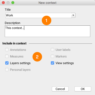 <table data-header-hidden><thead><tr><th width="80"></th><th></th></tr></thead><tbody><tr><td><strong>1</strong></td><td>Enter a name for the context. <br>If the name already exists, you will be prompted for a confirmation before overwriting the context with the same name. <br>When creating a new context, the settings of the displayed map are saved according to the selected options.</td></tr><tr><td><strong>2</strong></td><td>The following options are available: <br><strong>Annotations</strong>: Include the list of selected objects, the user's drawings, the labels added to the map, and the distance and surface measurements. <br><strong>Measures</strong>: Include measurements made on the map. <br><strong>Layers settings</strong>: Include layer settings (visibility, order, styles, filters, etc.). <br><strong>User labels</strong>: Include labels displayed on the map. <br><strong>Markers</strong>: Include markers for the points the user has searched for and located by entering coordinates. <br><strong>View settings</strong>: Include settings of the displayed map (scale, area displayed, units, etc.). <br>If an option is not selected, the settings associated with it are ignored and are not part of the context. <br>When the context is opened, these settings will not be affected. Certain options may not be available if they do not apply.</td></tr></tbody></table>