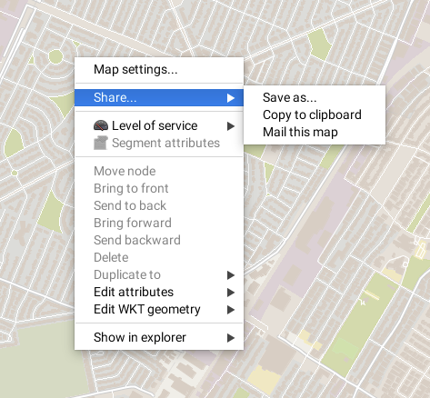 JMap allows you to create and share map images. You can copy a map to the clipboard and paste it into another application, send a map by email or save an image of the map in a file. These functions are accessed via the map's pop-up menu (right-click on the map).