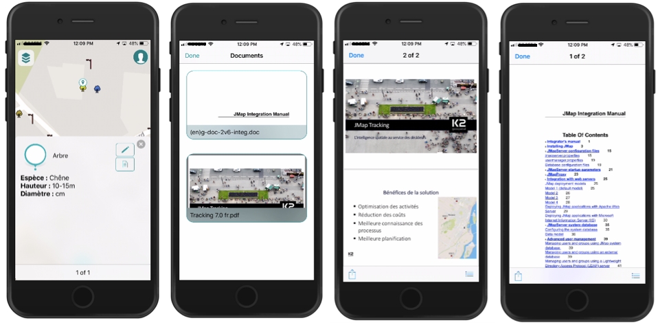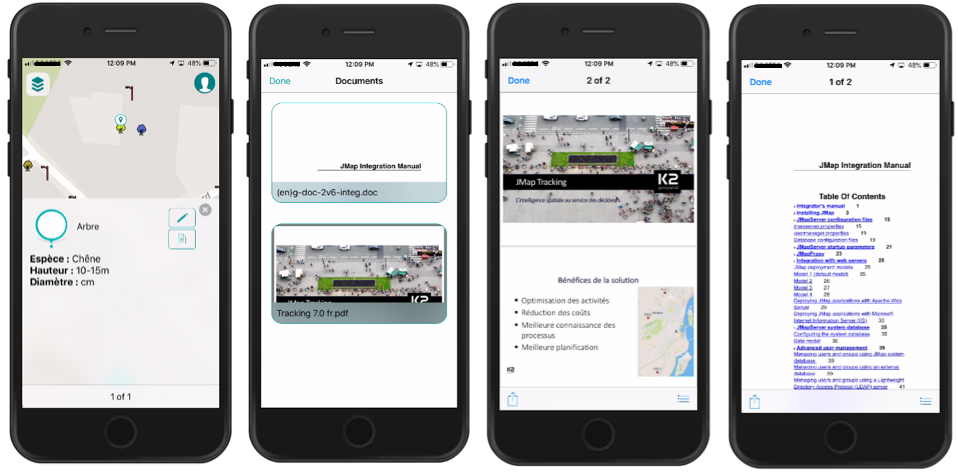 Some layers have descriptive information associated with layer elements or objects. The information is displayed in tooltips. In addition, if the Documents extension is found on the JMap server and you have the required permissions, a button in the tooltip will allow you to access the documents associated with the object. You can open and view the documents directly on your mobile device.
