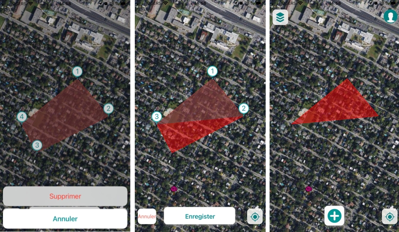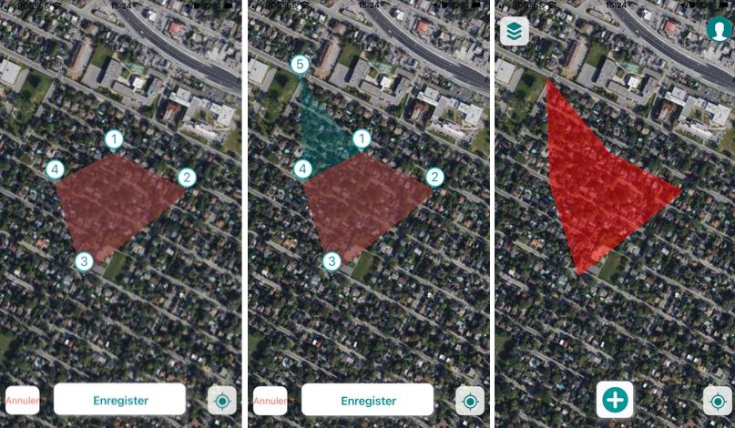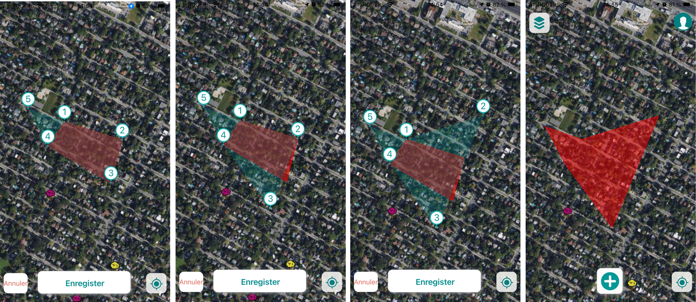Touch the map where you want to create the vertex. The new vertex is displayed with its number and the shape that will adopt the object with the movement is displayed transparently on the map.