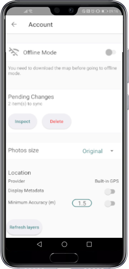 If you are working offline, when a network connection becomes available, disable Offline Mode in the Account screen. The changes you have made will be automatically synchronized. Note: The project's layer data may have been updated or modified on the JMap server. By touching Refresh layers, JMap Survey will download all of the data once again to make sure it is up-to-date on your device. This option is not required to save the changes you made with JMap Survey, but you should use it from time to time.