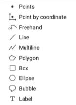 <table data-header-hidden><thead><tr><th width="92"></th><th></th></tr></thead><tbody><tr><td><img src="https://content.gitbook.com/content/DUF1p2rT0hfE3QBlbbvE/blobs/dWkAl6l7Y0jtm9hAuXqh/drawpoint.png" alt="" data-size="original"></td><td><strong>Point</strong><br>Add a new point by clicking on the map.</td></tr><tr><td><img src="https://content.gitbook.com/content/DUF1p2rT0hfE3QBlbbvE/blobs/gfAYSvcvhXl6j5SGMHFs/drawpointbycoordinate.png" alt="" data-size="original"></td><td><strong>Point by coordinates</strong><br>Add a point using specific X and Y coordinates.</td></tr><tr><td><img src="https://content.gitbook.com/content/DUF1p2rT0hfE3QBlbbvE/blobs/YffYlxp7USlwFMNkKdHo/drawfree.png" alt="" data-size="original"></td><td><strong>Freehand</strong><br>Allows you to draw freely on the map, as if using a pencil.<br>1. Click and hold the left mouse button to draw.<br>2. Release the button when you are finished.</td></tr><tr><td><img src="https://content.gitbook.com/content/DUF1p2rT0hfE3QBlbbvE/blobs/GRQKXDyOGAKTKHrZDdUB/drawline.png" alt="" data-size="original"></td><td><strong>Line</strong><br>Add a simple line by clicking on the map to define the first point and clicking on it again to define the second point and complete the line.</td></tr><tr><td><img src="https://content.gitbook.com/content/DUF1p2rT0hfE3QBlbbvE/blobs/cOFsVFFdvOJtjhsQoWxQ/drawmultiline.png" alt="" data-size="original"></td><td><strong>Multiline</strong><br>Add a new multiline (line with 1 or more segments). <br>1. Click on the map to define each of the nodes that will form the ends of the segments.<br>2. Double-click or press the space bar to complete the drawing.</td></tr><tr><td><img src="https://content.gitbook.com/content/DUF1p2rT0hfE3QBlbbvE/blobs/7Et9AhWZR1bK5Bwjp8Q0/drawpolygon.png" alt="" data-size="original"></td><td><strong>Polygon</strong><br>Add a new polygon on the map.<br>1. Click on the map to define each of the nodes that will form the ends of the segments.<br>2. Double-click or press the space bar to complete the drawing.</td></tr><tr><td><img src="https://content.gitbook.com/content/DUF1p2rT0hfE3QBlbbvE/blobs/qEKFho7aK6EzX4mGqrhm/drawbox.png" alt="" data-size="original"></td><td><strong>Box</strong><br>Add a new rectangle on the map.<br>1. Click to define the first point.<br>2. Click again on the desired location to define the second point and complete the box.</td></tr><tr><td><img src="https://content.gitbook.com/content/DUF1p2rT0hfE3QBlbbvE/blobs/FLfaCXslzPLV7ls1zpSd/drawcircle.png" alt="" data-size="original"></td><td><strong>Ellipse</strong><br>Add a circle on the map.<br>1. Click to define its central point.<br>2. Click again to complete a circle of the desired dimension.<br>NOTE: The circle can be changed to an ellipse with radii of various lengths.</td></tr><tr><td><img src="https://content.gitbook.com/content/DUF1p2rT0hfE3QBlbbvE/blobs/s0pPZWc239bvhShezdOz/drawbubble.png" alt="" data-size="original"></td><td><strong>Bubble</strong><br>Add a bubble with text on the map.<br>1. Click to determine the position that will be pointed by the stem of the bubble.<br>A window appears, allowing you to enter the text that will be inserted in the bubble (one or more lines).</td></tr><tr><td><img src="https://content.gitbook.com/content/DUF1p2rT0hfE3QBlbbvE/blobs/A31pVrmN6RGUxfd69IOg/drawtext.png" alt="" data-size="original"></td><td><strong>Label</strong><br>Add text directly on the map.<br>1. Click to define the insertion point of the text (upper left corner of the text).<br>A window appears, allowing you to enter text (one or more lines) to be added on the map.</td></tr></tbody></table>
