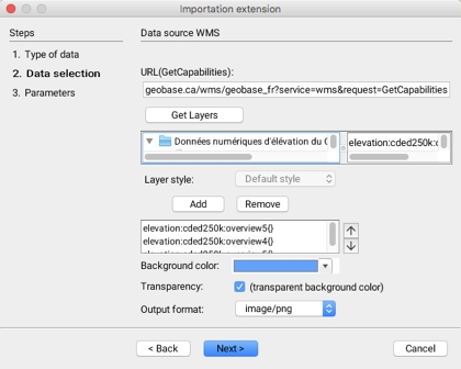 The second step in importing raster data from servers that comply with the WMS standard involves selecting the data sets to import.