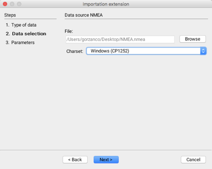 Select the character set used for the sentences of the NMEA file. If this parameter is not properly defined, it is possible that some characters will not be properly displayed. The default value is usually appropriate.