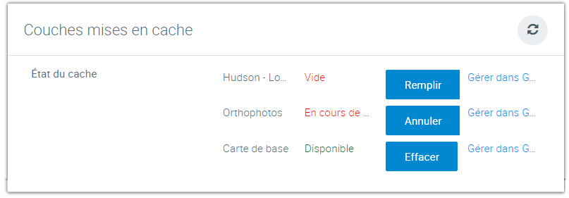 Pour chaque couche, appuyez sur **Remplir** pour démarrer la production du cache de tuile. Ce processus peut être annulé en appuyant sur **Annuler**. Pour effacer le cache pour une couche, appuyez sur le bouton **Effacer**. La production du cache peut être très longue. Si vous désirez gérer le cache directement à partir des interfaces de GeoWebCache, cliquez sur **Gérer dans GeoWebCache**.