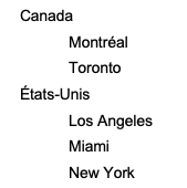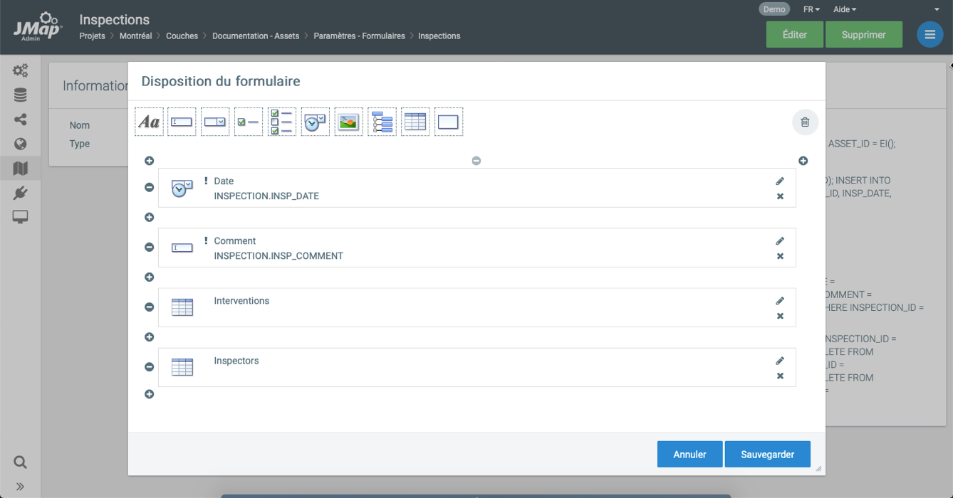 <table data-header-hidden><thead><tr><th width="149.06666666666666"></th><th></th></tr></thead><tbody><tr><td><p><img src="https://294136567-files.gitbook.io/~/files/v0/b/gitbook-x-prod.appspot.com/o/spaces%2FdAw9YBQHVS9E90BSZYQK%2Fuploads%2Fgit-blob-c575cdeb9e1cfe4f87e666c6c9a45dcdfdfee96a%2Fform_field_label.png?alt=media" alt="" data-size="original"></p><p>Étiquette</p></td><td>Texte statique à afficher dans le formulaire. L’alignement du texte (gauche, droite, centre) peut être spécifié, de même que le style de la police de caractères pour l’affichage du texte.<br>Il est possible d’utiliser certaines <a href="#fonctions">fonctions</a> dans le texte de l’étiquette.</td></tr><tr><td><p><img src="https://294136567-files.gitbook.io/~/files/v0/b/gitbook-x-prod.appspot.com/o/spaces%2FdAw9YBQHVS9E90BSZYQK%2Fuploads%2Fgit-blob-d026300a1bdfa371cb50f412a8dcef28954cd654%2Fform_field_textbox.png?alt=media" alt="" data-size="original"></p><p>Texte</p></td><td>Champ de saisie d’une valeur alphanumérique. Le champ associé doit être de type alphanumérique ou numérique.<br><strong>Masque de saisie</strong> : Un masque de saisie peut être utilisé afin de contrôler le format de la valeur saisie.<br><strong>Multiligne</strong> : (Champs alphanumériques seulement) Si cette option est activée, le champ de saisie sera affiché sur plusieurs lignes de texte, ce qui facilite la saisie de textes plus longs.<br><strong>Nombre maximal de caractères</strong> : (Champs alphanumériques seulement) Détermine la longueur maximale du texte qu’un utilisateur peut saisir. Cela doit respecter les contraintes du champ de la base de données qui contient les données.<br><strong>Validation de la plage</strong> : (Champs numériques seulement) Permet de définir une plage de valeurs acceptées (par ex. de 0 à 100).</td></tr><tr><td><p><img src="https://294136567-files.gitbook.io/~/files/v0/b/gitbook-x-prod.appspot.com/o/spaces%2FdAw9YBQHVS9E90BSZYQK%2Fuploads%2Fgit-blob-eca412b66fa6e5417bdfc404f20dd80bb9c3243d%2Fclip0079%20(1).png?alt=media" alt="" data-size="original"></p><p>Liste (choix unique)</p></td><td><p>Liste de valeurs dont seulement une valeur peut être sélectionnée.</p><p>Le champ associé doit être de type alphanumérique ou numérique.</p><p>Les valeurs de la liste peuvent être fournies dans plusieurs langues, si votre projet supporte plus d’une langue.<br>La liste peut être <strong>dynamique</strong>, c’est-à-dire que son contenu peut être modifié dynamiquement en fonction de la sélection d’une valeur dans une autre liste. Par exemple, sur la sélection d’un pays dans une liste, une autre liste se rafraîchit dynamiquement pour afficher uniquement les villes du pays sélectionné.</p><p><strong>Attribut parent</strong><br>Si la liste doit être dynamique, sélectionnez l’attribut parent.<br>Pour lier la liste B (enfant) à la liste A (parent), vous devez d’abord sélectionner l’attribut parent pour la liste B (attribut associé à la liste A). Sur un changement de la valeur sélectionnée dans la liste A, le contenu de la liste B sera mis à jour. Les valeurs de la liste B sont déterminées par la relation entre ses valeurs et les valeurs de l’attribut parent. Si la liste B possède une seule valeur, celle-ci est sélectionnée automatiquement.</p><p>Les valeurs de la liste peuvent être entrées manuellement, provenir d’une base de données ou provenir d’une autre source :<br><strong>Valeurs</strong><br>Entrez les valeurs dans l’espace prévu en spécifiant pour chaque cas, la valeur parent (seulement si la liste est dynamique), la valeur à utiliser dans la base de données et l’étiquette à afficher dans la liste. C’est la valeur qui est utilisée comme donnée. L’étiquette ne sert que pour l’affichage à l’utilisateur. Dans le cas où la valeur et l’étiquette sont les mêmes, entrez la même valeur 2 fois. Si la liste n’est pas dynamique, laissez la valeur parent vide.<br><strong>Obtenir valeurs d’une base de données</strong><br>Vous devez sélectionner la base de données de laquelle vous souhaitez obtenir les valeurs. Ensuite, entrez une requête SQL qui sera exécutée pour obtenir les valeurs parent (seulement si la liste est dynamique), les valeurs et les étiquettes à afficher. Normalement, les étiquettes devraient être uniques et triées.<br>Les exemples qui suivent utilisent la table MY_TABLE.<br><img src="https://294136567-files.gitbook.io/~/files/v0/b/gitbook-x-prod.appspot.com/o/spaces%2FdAw9YBQHVS9E90BSZYQK%2Fuploads%2Fgit-blob-0e267d68c6f2de646fc543e51b773b2c6926dc28%2Fclip0079.png?alt=media" alt=""></p><p><strong>Exemple</strong></p><p>Liste de pays, disponible en anglais et en français. Cette liste n’est pas dynamique. Elle est associée à un attribut COUNTRY.</p><p><code>SELECT * FROM MY_TABLE WHERE ITEM_TYPE = 'Country' ORDER BY ITEM_VALUE;</code></p><p>Dans cet exemple, le champ ITEM_VALUE contient la valeur, le champ ITEM_LABEL_EN contient le nom du pays en anglais et le champ ITEM_LABEL_FR contient le nom du pays en français.</p><p>Il n’y a pas de valeur parent puisque la liste n’est pas dynamique (n’a pas de liste parent).</p><p><strong>Exemple</strong></p><p>Liste de villes, disponible en anglais et en français. Cette liste est dynamique. Son attribut parent est COUNTRY associé à la liste précédente.</p><p>Elle présente la liste des villes pour le pays sélectionné dans la liste parent.</p><p><code>SELECT * FROM MY_TABLE WHERE ITEM_TYPE = 'City' ORDER BY ITEM_VALUE;</code></p><p>Dans cet exemple, le champ ITEM_VALUE contient la valeur, le champ ITEM_LABEL_EN contient le nom de la ville en anglais et le champ ITEM_LABEL_FR contient le nom de la ville en français.</p><p>Le champ PARENT_VALUE contient la valeur parent.</p><p><strong>Attention</strong> : Il est nécessaire que la requête SQL d’une liste enfant inclue le champ qui permet de faire la relation avec les valeurs paren