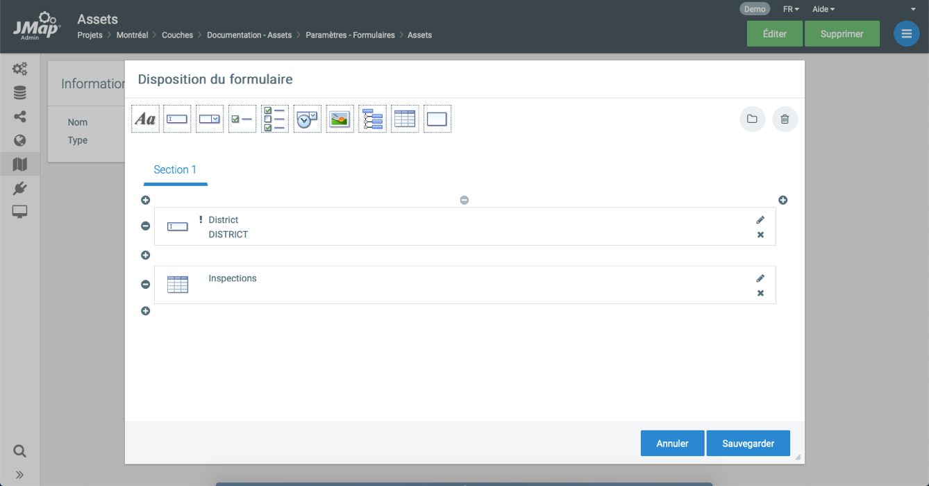 <table data-header-hidden><thead><tr><th width="57.1787072243346"></th><th></th></tr></thead><tbody><tr><td><strong>1</strong></td><td>Faites glisser une composante vers une cellule du formulaire. Toutes les cellules disponibles sont mises en surbrillance.</td></tr><tr><td><strong>2</strong></td><td>Appuyez sur <img src="https://294136567-files.gitbook.io/~/files/v0/b/gitbook-x-prod.appspot.com/o/spaces%2FdAw9YBQHVS9E90BSZYQK%2Fuploads%2F5ct9wvtZYBfXXXU3gmqX%2Fform-add-section.png?alt=media&#x26;token=5663b711-3584-4478-9cea-63622b1fad0c" alt="img" data-size="original"> pour créer une nouvelle section, pour effacer une section existante ou pour renommer une section. Appuyez sur <img src="https://294136567-files.gitbook.io/~/files/v0/b/gitbook-x-prod.appspot.com/o/spaces%2FdAw9YBQHVS9E90BSZYQK%2Fuploads%2FZj2xmnrQXhR8NDY3UGSF%2Fform-del-section.png?alt=media&#x26;token=3046cbf5-0127-41a4-89f8-f51f01d2bba4" alt="img" data-size="original"> pour réinitialiser tout le formulaire.</td></tr><tr><td><strong>3</strong></td><td>Accédez aux différentes sections à partir de ces onglets.</td></tr><tr><td><strong>4</strong></td><td>Appuyez sur les boutons <img src="https://294136567-files.gitbook.io/~/files/v0/b/gitbook-x-prod.appspot.com/o/spaces%2FdAw9YBQHVS9E90BSZYQK%2Fuploads%2FZsTnKPrSpZgclrarkI9y%2Fform-add.png?alt=media&#x26;token=571adc05-6b11-48e9-9a08-c50b9c6870ac" alt="img"> et <img src="https://294136567-files.gitbook.io/~/files/v0/b/gitbook-x-prod.appspot.com/o/spaces%2FdAw9YBQHVS9E90BSZYQK%2Fuploads%2Fpksd5tVPyHtGjmoPlMPf%2Fform-delete.png?alt=media&#x26;token=7abdd9f2-f78d-4f77-ac4f-092f8066ba23" alt="img"> pour insérer des rangées ou des colonnes vides aux endroits correspondants.</td></tr><tr><td><strong>5</strong></td><td>Le symbole <img src="https://294136567-files.gitbook.io/~/files/v0/b/gitbook-x-prod.appspot.com/o/spaces%2FdAw9YBQHVS9E90BSZYQK%2Fuploads%2FwcsIQ5MWmsx4Rldz7jGN%2Fform-lecture.png?alt=media&#x26;token=aabaa53b-86b3-4fa7-9f1b-489c5abbe341" alt="img"> indique que la composante est en mode lecture seule.</td></tr><tr><td><strong>6</strong></td><td>Le symbole <img src="https://294136567-files.gitbook.io/~/files/v0/b/gitbook-x-prod.appspot.com/o/spaces%2FdAw9YBQHVS9E90BSZYQK%2Fuploads%2FcRFeam92T32t1V8COkAh%2Fform-oblig.png?alt=media&#x26;token=7db845b4-f26e-47bf-9157-c67655c74115" alt="img"> indique que la valeur est requise.</td></tr><tr><td><strong>7</strong></td><td>Le bouton <img src="https://294136567-files.gitbook.io/~/files/v0/b/gitbook-x-prod.appspot.com/o/spaces%2FdAw9YBQHVS9E90BSZYQK%2Fuploads%2FCSi72L9Nh3DOQ6E60uVp%2Fform-edit.png?alt=media&#x26;token=b81c7e1d-9c20-46e8-a3ca-9f049d94b171" alt="img"> permettent de modifier les paramètres de la composante. Le bouton <img src="https://294136567-files.gitbook.io/~/files/v0/b/gitbook-x-prod.appspot.com/o/spaces%2FdAw9YBQHVS9E90BSZYQK%2Fuploads%2F6FCJgSxnpUfHO6fISnaS%2Fform-close.png?alt=media&#x26;token=33f5134a-e258-424e-a840-bc8776739cd6" alt="img">permet de supprimer la composante du formulaire.</td></tr></tbody></table>