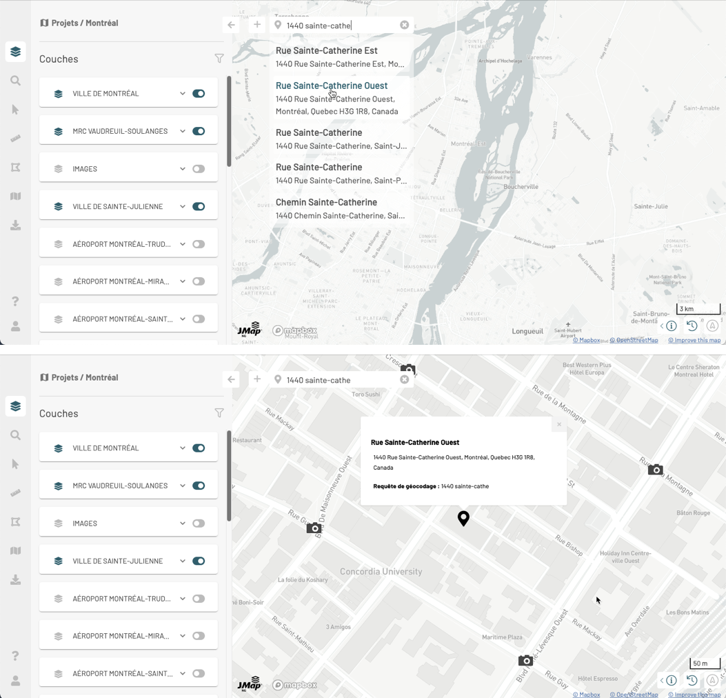 JMap NG utilise le service Mapbox Geocoding pour trouver le lieu.\