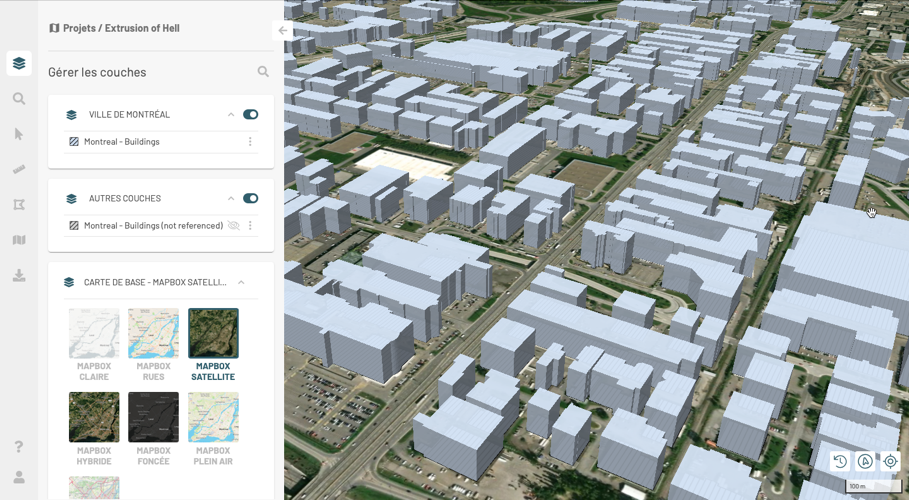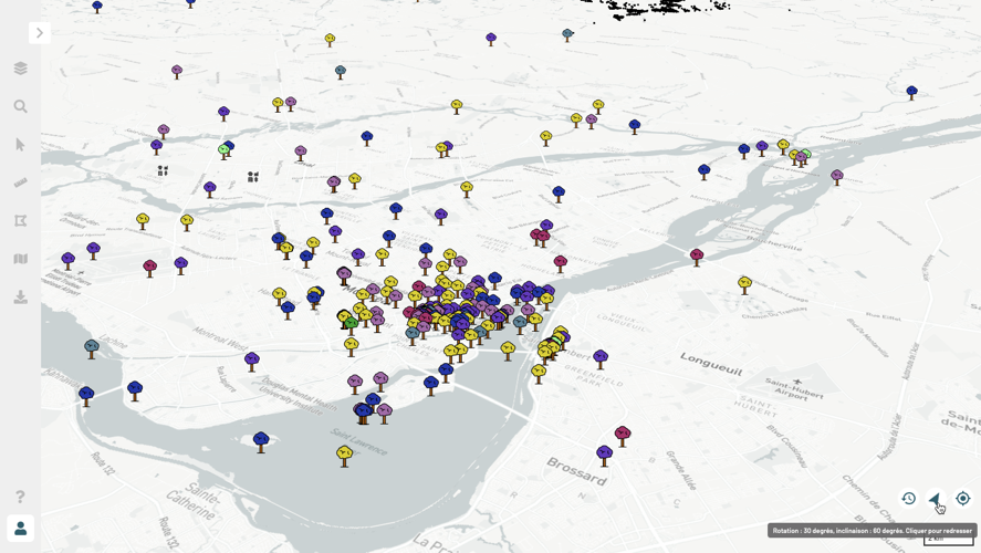 Certaines couches présentent des données en trois dimensions (3D). Vous pouvez naviguer ces données en 3D.