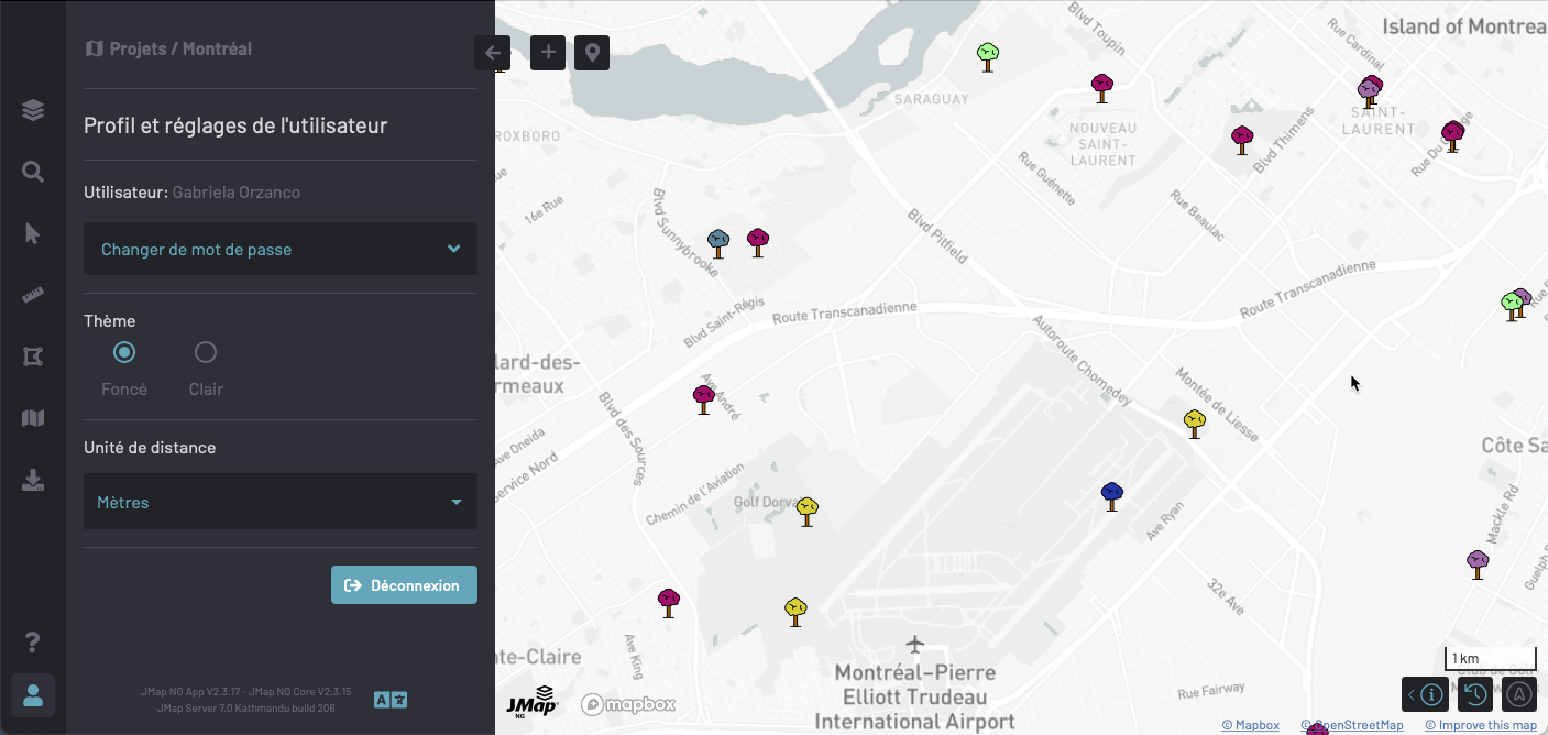 Le panneau **Profil et réglages de l'utilisateur** offre des fonctions de base visant à personnaliser l'interface de JMap NG.