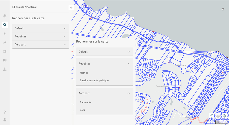 Les recherches vous permettent de sélectionner des éléments d'une couche sur la base des valeurs de leurs attributs. Vous pouvez par la suite examiner les attributs des éléments ainsi sélectionnés et exporter les informations en différents formats.