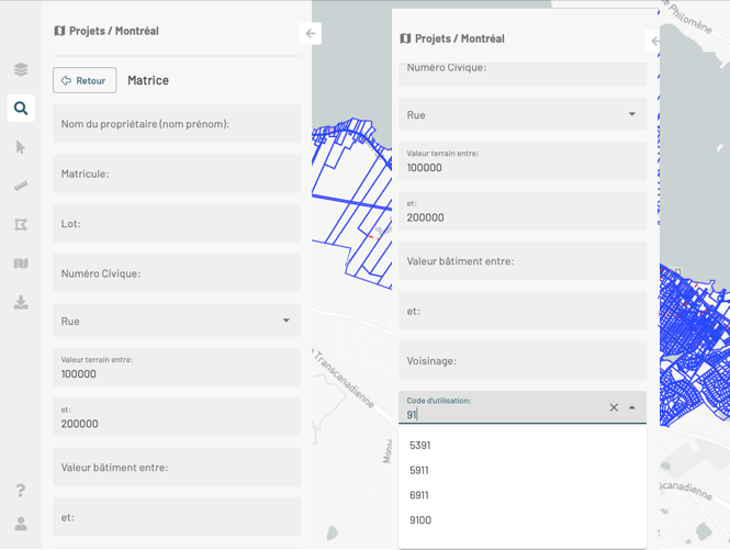 Une recherche sélectionne des éléments de la couche dont les valeurs des attributs correspondent aux termes que vous avez indiqué dans le formulaire. Des outils sont disponibles pour travailler avec ses éléments.
