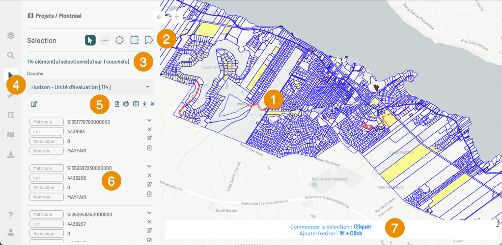 Aide pour sélectionner des éléments dans la carte. Si vous utilisez cette méthode, les éléments sélectionnés avec la recherche sont désélectionnes.
